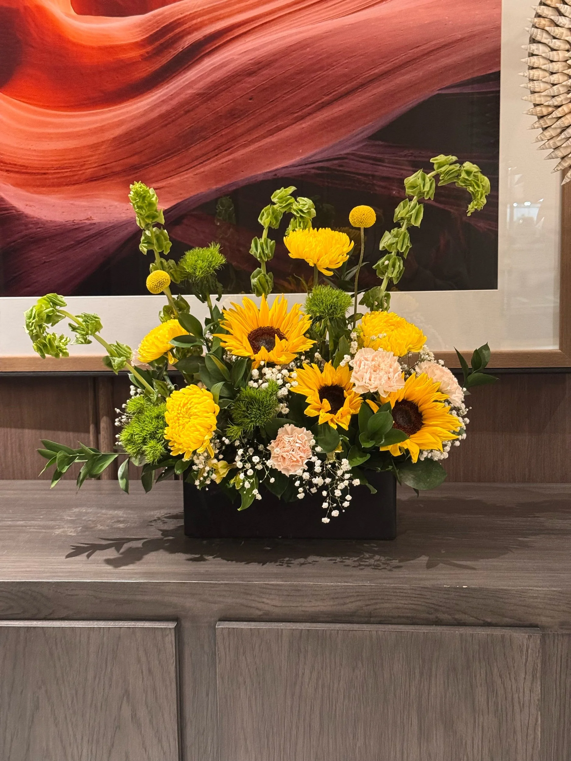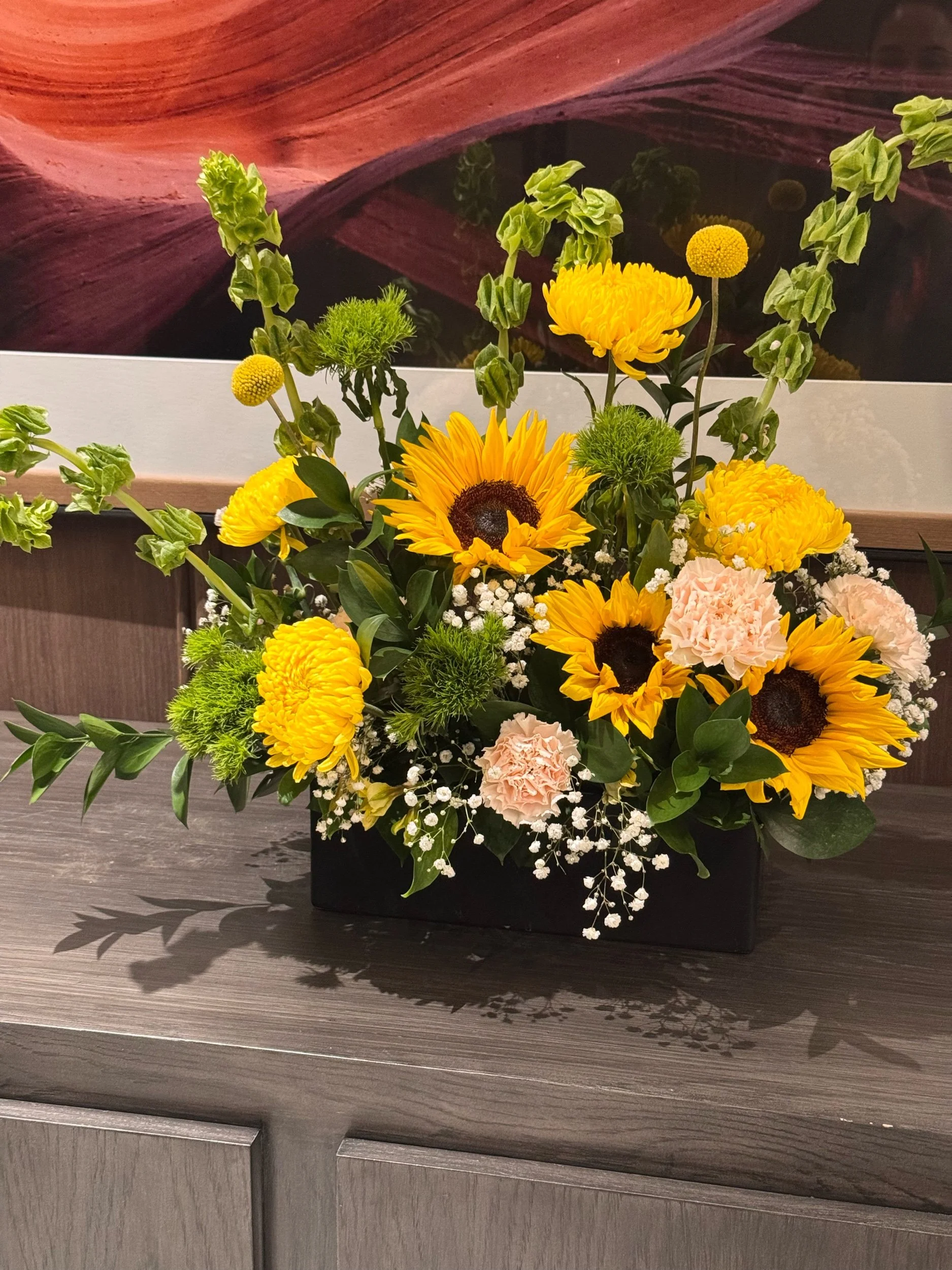 Arranged in an elegant black rectangular ceramic vase, the contrast makes every golden bloom pop, giving the design a modern, elevated feel that stands out effortlessly.