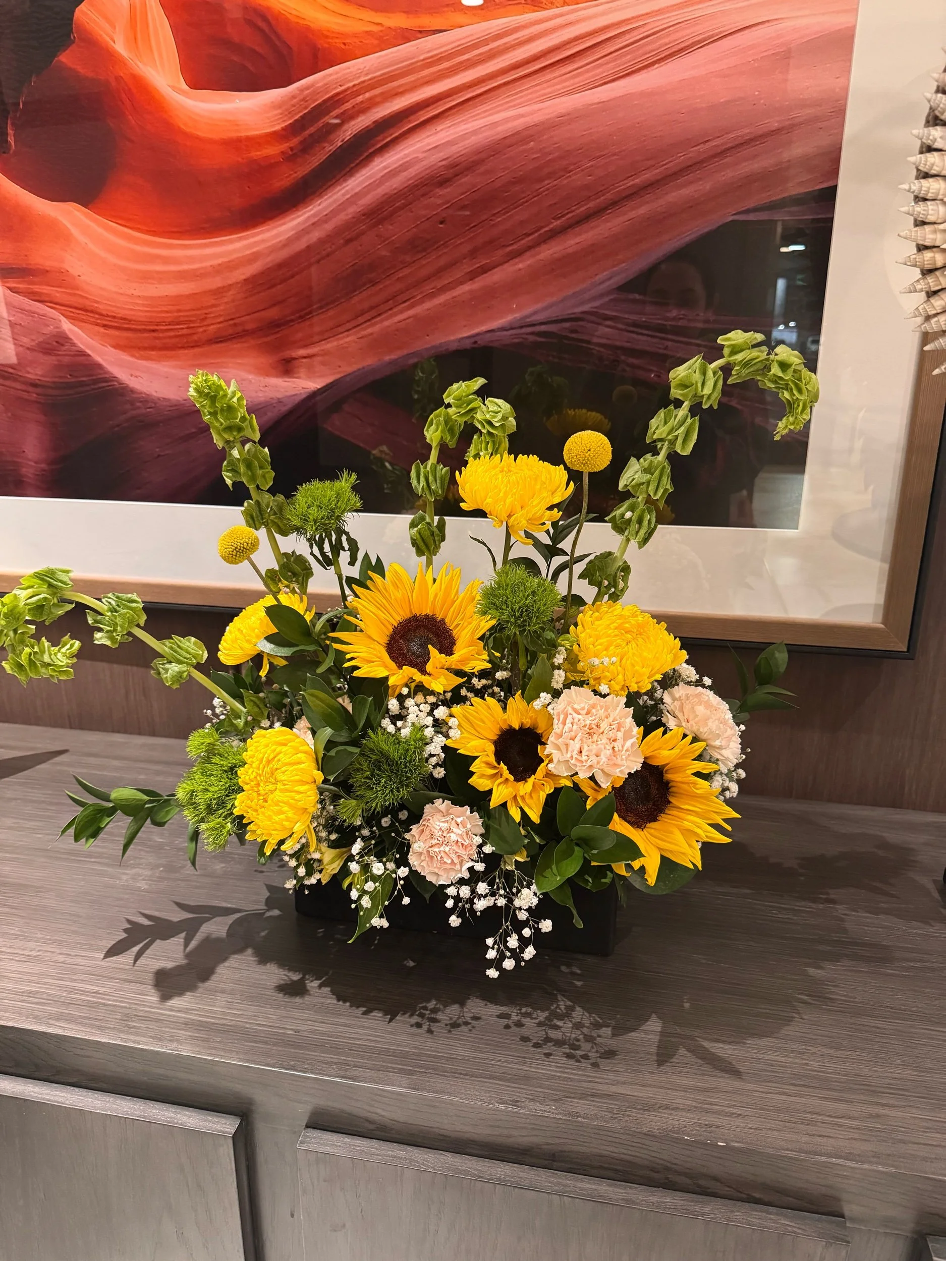 Bright, bold, and unapologetically cheerful — GOOD VIBES ONLY is designed to instantly lift the mood and light up any space. This radiant arrangement features sunny sunflowers, elegant cream carnations, playful billy balls, sprinkles of baby’s breath, lush yellow chrysanthemums and elegant bells of Ireland, all thoughtfully styled to create a vibrant burst of happiness.